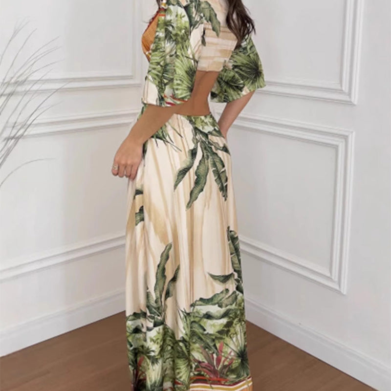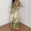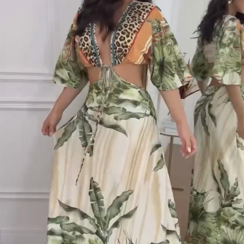 WEITE ÄRMEL UND LEOPARDENMUSTER – Dieses Kleid besticht durch dramatisch weite, fließende Ärmel und einen auffälligen Mix aus tropischem Blattmotiv und Leopardenmuster – für einen wilden, sommerlichen Look, der sofort ins Auge fällt.