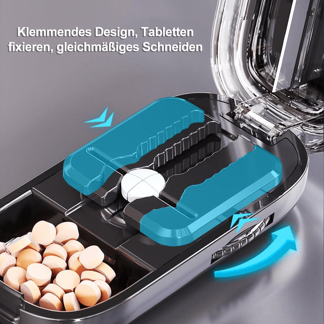 Multifunktionaler Pillenschneider - Unser Pillenteiler kann mehrere Tabletten gleichzeitig halbieren oder vierteln und spart so Zeit und Mühe. Die untere Box bietet zusätzlichen Platz für Medikamente, ideal für den Transport in Handtasche oder Rucksack.