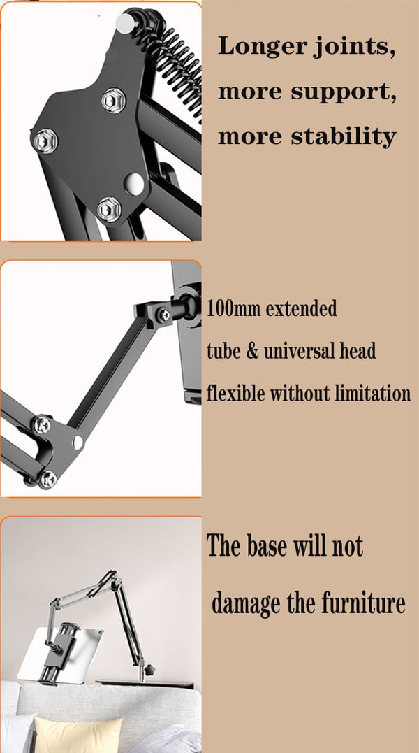 Sie können ihn in jeder Öffnung oder auf jeder Oberfläche verwenden, z. B. an einem Kopfteil, Sofa oder Schreibtisch. Sie können stehen, sitzen, sich anlehnen oder sich sogar hinlegen, Ihre Hände frei machen und diesen Roboterarm genießen.
