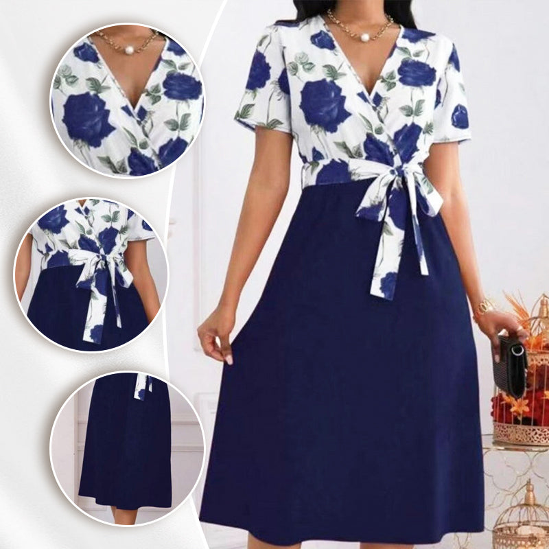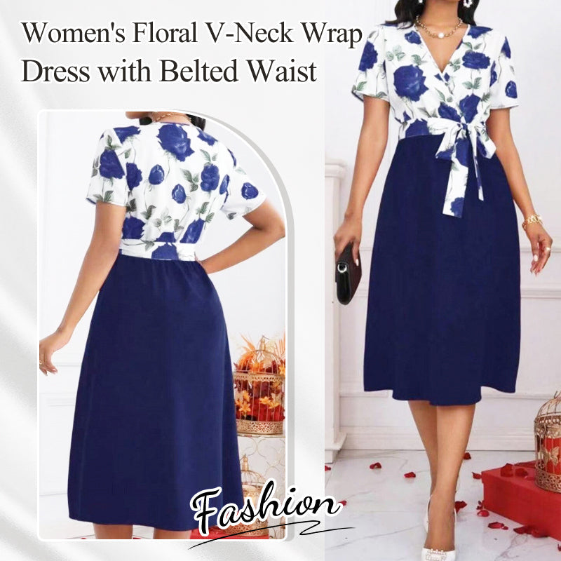👗Wickelkleid mit Blumenmuster und V-Ausschnitt und Gürtel für Damen