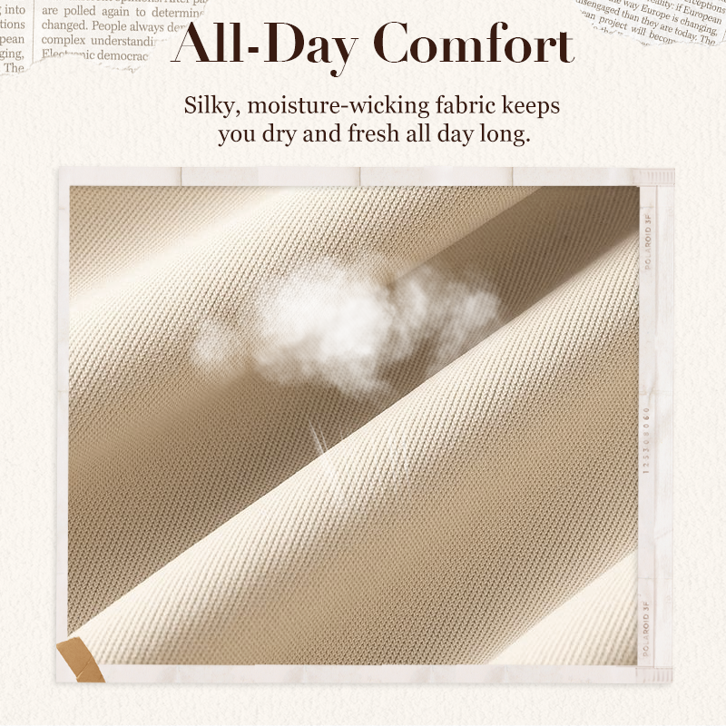 FEUCHTIGKEITSABWEISENDES, ATMUNGSAKTIVES MATERIAL – Hergestellt aus seidigem, atmungsaktivem Material, das Feuchtigkeit ableitet und Sie den ganzen Tag frisch und trocken hält. Das hochelastische Material passt sich Ihrer Form an, ohne den Komfort zu beeinträchtigen – auch bei langem Tragen.